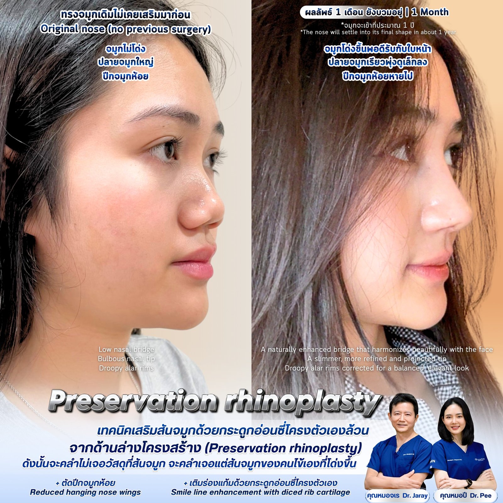 ภาพก่อน–หลังในเคสนี้สะท้อนแนวคิดของ Preservation Rhinoplasty อย่างชัดเจน นั่นคือการปรับรูปทรงจมูกโดยคงโครงสร้างสำคัญไว้ เพื่อให้ได้ผลลัพธ์ที่สมดุล ดูเป็นธรรมชาติ และมีความมั่นคงในระยะยาว ข้อมูลเคส คนไข้ไม่เคยผ่านการศัลยกรรมจมูกมาก่อน โดยมีปัญหาเดิมคือ: สันจมูกต่ำ ปลายจมูกใหญ่ ปีกจมูกตก