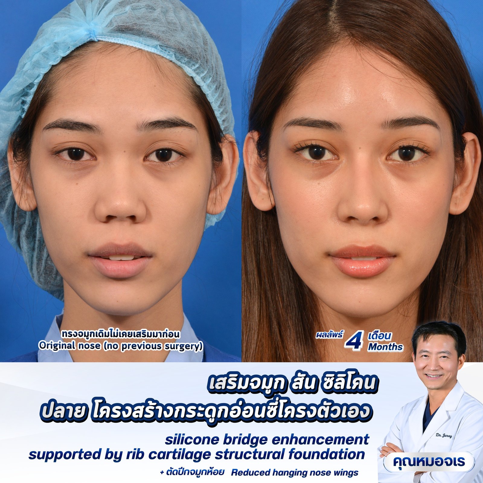 จมูกที่สวยงามไม่จำเป็นต้องเปลี่ยนแปลงมาก แต่คือการปรับให้ สมดุล เข้ากับใบหน้า และดูเป็นธรรมชาติ เคสนี้แสดงให้เห็นถึงการเสริมจมูกด้วย ซิลิโคนร่วมกับโครงสร้างกระดูกอ่อนซี่โครง เพื่อเพิ่มความคมชัดและความสมดุลของรูปหน้าในระยะเวลา 4 เดือน จากจมูกเดิมที่ยังไม่เคยทำ สู่รูปทรงที่ดูเรียบเนียน มีมิติ และเข้ากับใบหน้าอย่างลงตัว