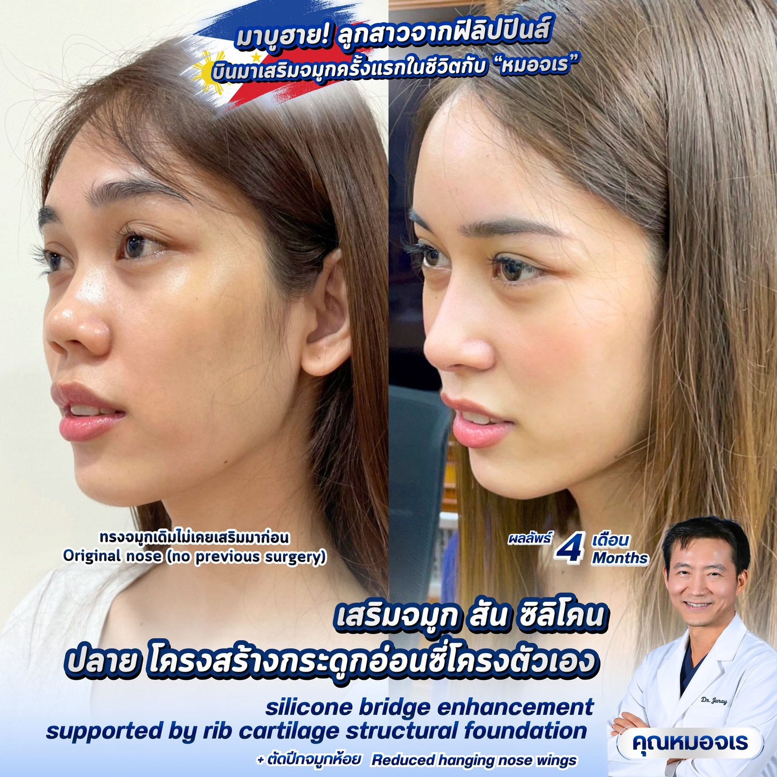 ความสวยที่ดูเป็นธรรมชาติ เริ่มต้นจาก โครงสร้างที่ดี สัดส่วนที่เหมาะสม และการออกแบบอย่างละเอียด เคสนี้เป็นผู้ป่วยจากประเทศฟิลิปปินส์ที่เดินทางมาทำศัลยกรรมจมูกครั้งแรกกับ นพ.จรายุ เครือณาม (Dr. Jaray Krainam, MD) และได้ผลลัพธ์ที่ดูสวยละมุนและสมดุลภายใน 4