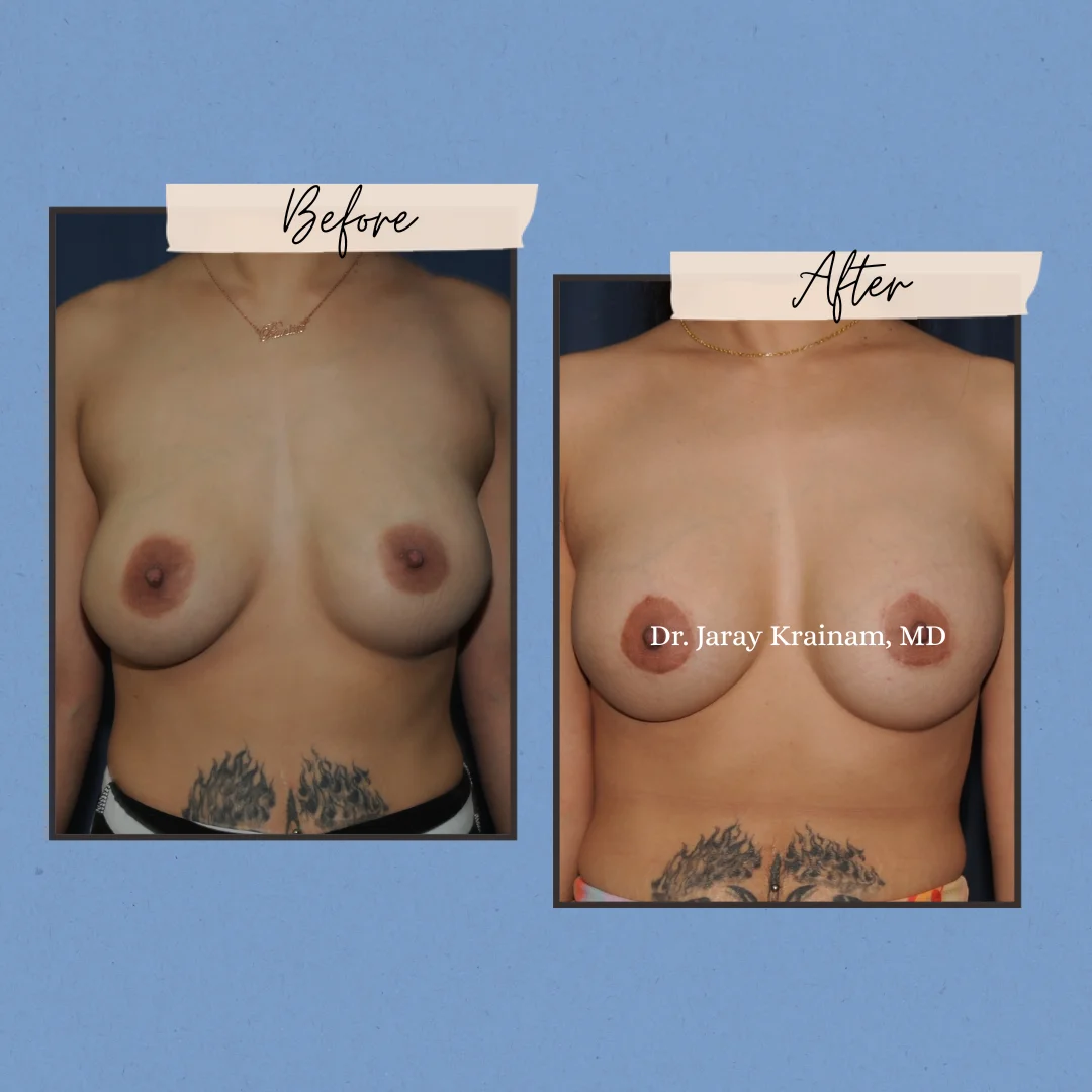 ศัลยกรรมเสริมหน้าอกร่วมกับยกกระชับ (เทคนิคแผลรอบปานนม Periareolar) – ภาพก่อนและหลังการผ่าตัด